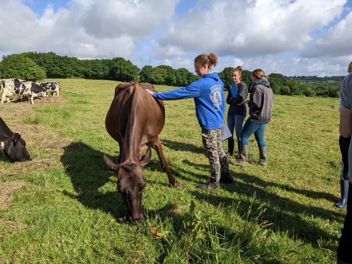 Après un tour par la salle de traite, tout le monde reprend son véhicule pour retrouver les génisses sous le viaduc de Daoulas. La visite se clôture au sommet de la colline où certains étudiants caressent les animaux avec passion, tandis que d’autres profitent d’une petite pause au soleil.