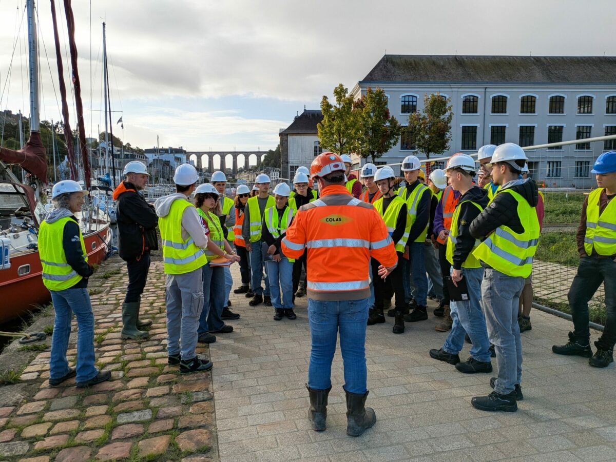 Nos étudiants de première année de BUT Génie Civil Construction Durable ont effectué le déplacement sur chantier le plus court de l’histoire du département ! L’entreprise de Travaux Publics Colas leur a fait visiter le chantier du Quai du Léon, situé juste devant l’IUT.