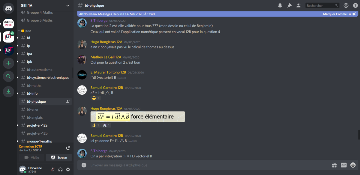 Thibault ajoute que Discord permet aussi « d’intégrer des « bots » qui sont des programmes, que tout le monde peut créer, qui permettent de gérer certaines choses. Par exemple nous avons un bot qui permet d’écrire des formules mathématiques, ce qui aurait été moins lisible juste au clavier sans ce bot. Ou encore un bot qui nous a permis d’attribuer des rôles, donc des permissions, quand les membres appuyaient sur un émoticône. Ainsi l’attribution des différents groupes TD et TP s’est faite automatiquement sans que nous ayons à donner manuellement à chacun son groupe ».